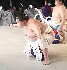 Upon graduating, he chose to turn professional and joined Magaki stable.[12] He entered the ring in the same tournament as soon to be well-known Chiyotairyū and Jōkōryū. Upon entering he was given the shikona surname of Wakamishō (若三勝).[12] From his first pro tournament in July 2011 he excelled, posting only three losses in three tournaments and spending only one tournament in each of the lower divisions of jonokuchi, jonidan and sandanme.[13] In his sandanme tournament in November 2011, he had a perfect 7–0 record and participated in a playoff for the championship, which he lost to the aforementioned Jōkōryū, then still known as Sakumayama.[14] From his third division makushita debut in January 2012, he had three consecutive 5–2 records before posting two consecutive losing tournaments in July and September 2012, the only two of his career up to that point.[13] He bounced back from this in the following November tournament, garnering a 4–3 record.[13] For the next four tournaments his success continued and he never had more than two losses in any tournament.[13] During the period, his stable closed, and he transferred to Isegahama stable.[12] He had become frustrated with a lack of training opportunities at the small Magaki stable,[15] as with the ill health of his stablemaster and various scandals there were sometimes no other coaches or wrestlers present.[16] At Isegahama by contrast he was able to practice with many higher ranked wrestlers to improve his technique.[12] His 6–1 record at makushita 4 in July 2013 was enough to earn him promotion to the salaried ranks of jūryō in September 2013.[13][17]