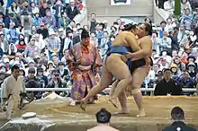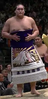 In his makuuchi division debut he had only a 2–7 record on the 9th day.[19] However, from then on he won six straight bouts in six days to pull out a kachi-koshi or winning tournament.[19] Then in the following May tournament he started out with an unpromising 4–6 record, but then won 5 straight to finish with a strong showing of 9–6.[20] Two tournaments later in the September 2014 tournament at maegashira 1 he was up against top notch competition, including several san'yaku or titled wrestlers, and he only managed to eke out a 6–9 record.[21] This was only his third make-koshi or losing record in a tournament in his career and his first in the salaried rank. He only fell to maegashira 2 though, being helped by bad showings from several other wrestlers. It was in this tournament in November 2014 that he truly began to show his mettle in the top division; after going only 4–6, he beat an ōzeki and two sekiwake in the last 5 days to pull off an 8–7.[22] In January 2015, he defeated the ōzeki Gōeidō and Kisenosato, the sekiwake Aoiyama and both active komusubi on the way to an 8–7 record.[23] He was awarded the Fighting Spirit Prize, or kantosho, his first special prize.[13]