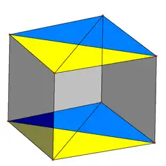 ![]() An orthographic projection showing the pair of parallel tetrahedra projected as a quadrilateral divided into yellow and blue triangular faces. Each tetrahedra also have two other uncolored triangles across the opposite diagonal. |