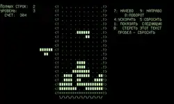 Because the Electronika 60 had no graphical interface, Pajitnov modelled the field and pieces using spaces and brackets[18]:299 (45 lines of 80 ASCII characters).[13]1:50 Realizing that completed lines filled the screen quickly, Pajitnov decided to delete them, creating a key part of Tetris gameplay.[20] This early version of Tetris had no scoring system and no levels, but its addictive quality distinguished it from the other puzzle games Pajitnov had created.[22] Pajitnov wrote the game using Pascal for the RT-11 operating system on the Electronika 60.[13]1:50