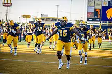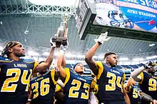 This season, however, their postseason fortunes would improve as a road matchup against the top-seeded Central Washington Wildcats saw the Lions trailing 28-7 at halftime, but a ferocious comeback would produce a 34-31 double-overtime win[33] and TAMC's first opportunity to advance past the second round of the playoffs in school history. In the quarterfinals, Carthel's squad would face off against another top team on the road in Minnesota State and pull off another surprising victory.[34] This moved them into a quarterfinal matchup against a low-ranked program in Harding, who also knocked off the top seed in their division on their way through the bracket. A comfortable 31-17 victory[35] gave the Lions their first-ever appearance in the NCAA Division II National Championship.