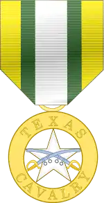 | Description | The ribbon drape is of yellow, green and white stripes. The medal consists of crossed swords over a white star within a gold circle. Upon the gold circle are the words "Texas Cavalry". |