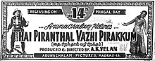 Thai Piranthal Vazhi Pirakkum (transl.The birth of Thai will pave the way for new opportunities)[lower-alpha 1] is a 1958 Indian Tamil-language drama film, written directed and produced by A. K. Velan in his directorial debut. The film stars S. S. Rajendran, M. N. Rajam, Prem Nazir, Rajasulochana and V. K. Ramasamy.[2] Released on 14 January 1958, it emerged a major commercial success, and was remade in Telugu as Manchi Manasuku Manchi Rojulu (1958), in Hindi as Barkha (1959), and in Kannada as Rowdy Ranganna (1968).