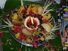 Thalappoli is a ritual ceremony performed as a vow in Hindu temples in Kerala, India. Bathed and dressed in beautiful traditional clothes and Kerala ornaments, the women, mainly girls, line up with holding a thalam (a metal plate) in their hands filled with fresh paddy, flowers, rice, coconut (usually broken into two pieces), a lighted lamp and go around the temple with kurava (traditional form of sound), shouts and playing of instruments.[1][2] This was regularly practiced in the temples of bhagavathy (Bhadrakali).[3]