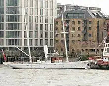 Following the Royal convoy came groups of powered vessels. These included a number of now very rare steam vessels, Alaska, the oldest working passenger vessel on the Thames, and the tugs Barking and Kennet.[16] Among the working vessels were Amaryllis, umpire's launch for the Henley Royal Regatta; White Heather, the only surviving narrow-beam London canal tug; the Stork HM Customs and Excise boat, James Stevens No.14, the world's oldest motor lifeboat; and the Massey Shaw fireboat of the London Fire Brigade, veteran of Operation Dynamo, Dunkirk.[16] The Dunkirk Little Ships flotilla comprised fifty-five small craft, with a further five vessels in other sections. They included Sir Malcolm Campbell's Blue Bird of Chelsea, the Breda from the TV series The Prisoner, and MTB102 which also carried Churchill and Eisenhower on 3 June 1944 to view the D-Day fleet.[16] Forces vessels included Royal Naval Steam Cutter No. 438, built the year of Queen Victoria's Diamond Jubilee; RASCV Humber, the last wooden vessel in service with the Army, and Atta Boy,[25] a launch from HMS Royalist at the Battle of Jutland in 1916.[16] The Cornish fishing lugger Barnabas, built in 1881, had sailed 450 miles from Cornwall for the pageant, and carried St Piran's Flag, the largest flag born by any vessel in the flotilla.[26][27]