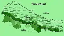 The Tharu people are an ethnic group indigenous to the Terai in southern Nepal and northern India.[4][5][6] They speak Tharu languages.[7] They are recognized as an official nationality by the Government of Nepal.[8] In the Indian Terai, they live foremost in Uttarakhand, Uttar Pradesh and Bihar. The Government of India recognizes the Tharu people as a scheduled tribe.[9][10]