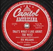 "That's What I Like About the West" is a song written by Edith Bergdahl and Robert McGimsey, performed by the Tex Williams (and His Western Caravan), and released in 1947 on the Capitol Americana label (catalog no. A40031). In October 1947, it peaked at No. 3 on the Billboard folk chart.[1] It was also ranked as the No. 14 record on the Billboard 1947 year-end folk juke box chart.[2]