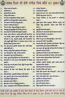 The 52 Hukams are a set of instruction in Sikhism set by Guru Gobind Singh in Nanded, Maharashtra, India in 1708.[1][2] These edicts sum up the ideal way of life of the Khalsa and serve as a code of conduct for the Khalsa Panth. Members of the Khalsa (baptized Sikhs) aim to follow all the 52 edicts.