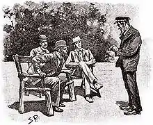 ![]() From left to right, Justice Trevor, Victor Trevor, Holmes, and Hudson, 1893 illustration by Sidney Paget in The Strand Magazine | |||