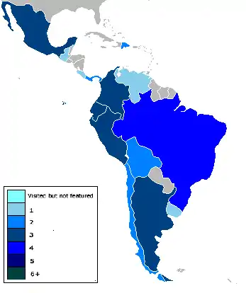| Colombia | 3 (1, 2, 5) | 7 | |