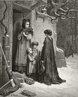 The readers of his time were aware of the Christian duty of charity and therefore sensed the moral ambiguity of the fable. This is further brought out by Gustave Doré's 1880s print which pictures the story as a human situation. A female musician stands at a door in the snow with the children of the house looking up at her with sympathy. Their mother looks down from the top of the steps. Her tireless industry is indicated by the fact that she continues knitting but, in a country where the knitting-women (les tricoteuses) had jeered at the victims of the guillotine during the French Revolution, this activity would also have been associated with lack of pity.