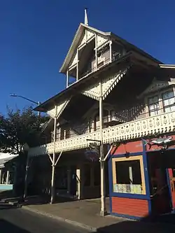 In about 1871 the company constructed what is known as The Arcade. The building, designed by the locally prominent architect Samuel Pratt, is a three-story wood frame construction, originally with gingerbread-decorated balconies in front and back. The lower two floors are both the full width of the building, although the first floor is punctured by a passage connecting Circuit Ave. to Wesleyan Grove. The third floor is significantly smaller than the lower floors.[2]