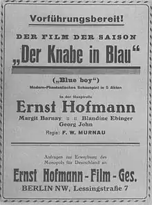 The Boy in Blue (German: Der Knabe in Blau and also known as Emerald of Death) is a 1919 silent German drama film directed by F. W. Murnau. It was Murnau's directorial debut. The film is now considered to be a lost film,[1] though the Deutsche Kinemathek film archive possesses 35 small fragments ranging from two to eleven frames in length.[2]