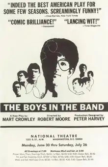 The play premiered Off-Broadway on April 14, 1968, at Theater Four,[20] and closed on September 6, 1970, after 1,001 performances.[10] Directed by Robert Moore, the cast included Kenneth Nelson as Michael, Peter White as Alan McCarthy, Leonard Frey as Harold, Cliff Gorman as Emory, Frederick Combs as Donald, Laurence Luckinbill as Hank, Keith Prentice as Larry, Robert La Tourneaux as Cowboy, and Reuben Greene as Bernard. The play was one of the early works to present a story centered on homosexuals.[21] In 1968, although only originally scheduled to run for five performances at a small venue off Broadway, it was a fast success and was moved to a larger theater. It went on to have a run in London as well.[22] The premiere's actors such as Laurence Luckinbill drilled a hole in the set so they could spy on whoever was in the house's best seats, and in the initial weeks, saw Jackie Kennedy, Marlene Dietrich, Groucho Marx, Rudolf Nureyev, and New York mayor John Lindsay. Despite the success of the play, all the gay members of the original company stayed in the closet after the premiere. Between 1984 and 1993, five of the gay men in the original production (as well as director Robert Moore and producer Richard Barr) died in the ensuing AIDS epidemic.[19]