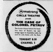 "The Case of Colonel Petrov" is a 1956 episode of the American television series Armstrong Circle Theatre about the Petrov Affair.[1][2]