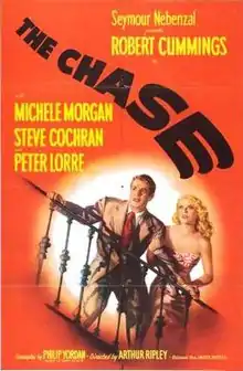 The Chase is a 1946 American film noir directed by Arthur Ripley. The screenplay by Philip Yordan is based on Cornell Woolrich's 1944 novel The Black Path of Fear. It stars Robert Cummings as Chuck Scott, a veteran who suffers from hallucinations. When he returns a lost wallet to violent mobster Eddie Roman (Steve Cochran), Eddie offers to hire him as a chauffeur. Chuck becomes mixed up in a plot to help Eddie's wife Lorna (Michèle Morgan) run off to Havana to escape her cruel husband.