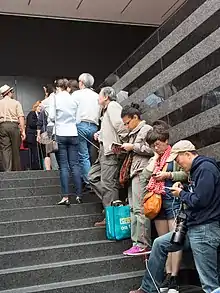 The Clock premiered 15 October 2010 at White Cube's gallery in central London.[2] Since then, it has attracted hundreds of thousands of visitors and found crossover success beyond art patrons.[27][28] The Paula Cooper Gallery exhibited it in early 2011, where it attracted 11,500 visitors over the course of a month. In mid 2012, the Lincoln Center for the Performing Arts showed it to 18,000 people over six weeks.[29] MoMA heavily promoted its run with a silent disco, a New Year's celebration and a dedicated @TheClockatMoMA account on Twitter.[18] The month-long exhibition drew over 40,000 people.[29]