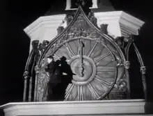 Marclay viewed The Clock as a memento mori.[13] In contrast to the escapism that cinema provides, The Clock draws attention to how much time the audience has spent watching it.[10] As they spend more time with the film, its actors reappear at various points in their careers. To make this theme more explicit, Marclay included symbols of time and death in connecting shots. These included sunsets; withering flowers; and burning cigarettes, which he described as "the twentieth-century symbol of time", a modern version of burning candles.[4][28] Marclay included shots of turntables and vinyl records not only as a representation of "capturing time, trying to hold it back", but also as a self-reference to his earlier works that used vinyl.[28]