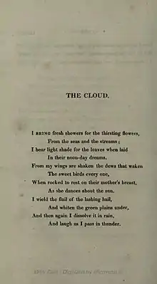 A review of the 1820 Prometheus Unbound collection in the September and October 1821 issues of The London Magazine noted the originality of "The Cloud": "It is impossible to peruse them without admiring the peculiar property of the author's mind, which can doff in an instant the cumbersome garments of metaphysical speculations, and throw itself naked as it were into the arms of nature and humanity. The beautiful and singularly original poem of 'The Cloud' will evince proofs of our opinion, and show the extreme force and freshness with which the writer can impregnate his poetry."[5]