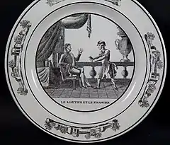 Following the French Revolution, there were further attempts to give the fable new dramatic life. Les Deux Voisins was a prose comedy with sung intervals by Charles J. La Roche which had a single night’s performance in 1791.[21] This was followed in 1793 by Pierre-Antoine-Augustin de Piis’ much more successful musical, Le Savetier et le Financier, which had repeated performances over the following years.[22] The subject was taken up again in another one-act musical in 1815, Le Savetier et le Financier ou Contentement Passe Richesse (Better than wealth is content), by Nicolas Brazier and Jean-Toussaint Merle.[23] This was successful enough for a scene from the production to appear as a commercial chimney plaque soon after.[24]