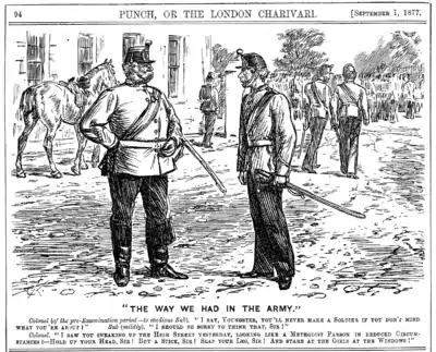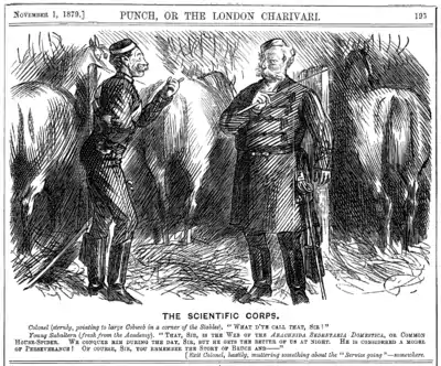 Squire Bancroft, manager of the Haymarket Theatre had asked Burnand to create a new version of Bayard's story. Bancroft, however, decided not to stage the play, giving Burnand more license to freely adapt it. The "aesthetic craze," was an obvious target for Burnand, who had been a regular contributor to Punch since 1863 and had become its editor in 1880 (a position he held until 1906). Beginning in the late 1870s, George du Maurier had published a long series of cartoons in the magazine satirizing the aesthetes.[4][5] "The Colonel" was a recurring character in Punch.[6] Punch had so frequently attacked the aesthetic movement, as The Observer noted, that The Colonel came at a point when it "might, indeed, have been thought that Punch had well nigh played the subject out."[7] Fun, a rival publication, wryly noted that Burnand should have acknowledged du Maurier as co-author.[5] According to Burnand's memoir, Frederic Clay leaked the information to him that Gilbert and Sullivan were working on an "æsthetic subject", and so Burnand raced to produce the play before the operatic duo's Patience opened.[8]
