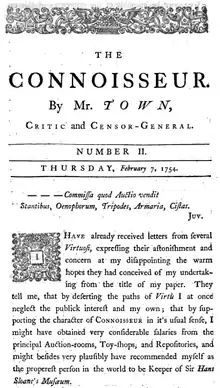 The Connoisseur (by Mr. Town [pseud.], Critic, and Censor-General. 2 vols. 140 nos. (31 January 1754 – 30 September 1756)), was a London weekly eighteenth century newspaper founded and chiefly run by George Colman the Elder and the parodist Bonnell Thornton as a 'plebeian' counterpart to Edward Moore's The World, a periodical of about the same time, which dealt more with the interests of aristocrats.[1] James Boswell says in his Life of Johnson: