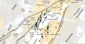 The Cook Inlet Basin is a northeast-trending collisional forearc basin that stretches from the Gulf of Alaska into South central Alaska, just east of the Matanuska Valley. It is located in the arc-trench gap between the Alaska-Aleutian Range batholith and contains roughly 80,000 cubic miles of sedimentary rocks.[1] These sediments are mainly derived from Triassic, Jurassic and Cretaceous sediments.
