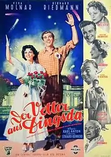 The Cousin from Nowhere (German: Der Vetter aus Dingsda) is a 1953 West German operetta film directed by Karl Anton and starring Vera Molnar, Gerhard Riedmann and Grethe Weiser. It was shot at the Wiesbaden Studios in Hesse and on location around Markgröningen, Tübingen, Bietigheim and Bad Urach. The film's sets were designed by the art directors Erich Kettelhut and Max Vorwerg. It is based on the 1921 operetta The Cousin from Nowhere composed by Eduard Künneke.[1]