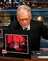American talk show host David Letterman also guest starred in "The D'oh-cial Network", appearing as himself in the couch gag in the Simpsons opening sequence at the beginning of the episode.[4] The couch gag sees the Simpson family arriving in New York City to the tune of "Rhapsody in Blue" to be guests on Late Show with David Letterman. The Simpsons music editor Chris Ledesma wrote on his blog that there was originally a discussion among the staff of the show about how the sequence would be scored. According to Ledesma, Jean "wanted something hustly-bustly that represented New York City. Thoughts immediately turned to the music of George Gershwin. Woody Allen had used 'Rhapsody in Blue' to great effect in Manhattan and probably connected forever in people’s minds the black & white images of New York with the melodies of that piece."[1] Ledesma wrote that acquiring the license to use the musical piece was expensive, but Jean thought "it would be the perfect piece to use for the couch gag."[1] The dark cabaret band Tiger Lillies performed their version of the Simpsons theme over the closing credits of the episode.[1] The Simpsons creator Matt Groening, a fan of the band, was responsible for recruiting its members to the show.[13]