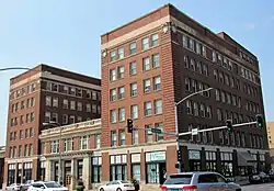 Stockholders incorporated the Davenport Hotel Company in 1905 to construct a modern hotel that was roughly equidistant from the city's two passenger depots.[2] The construction of the Davenport Hotel in 1907 ushered in the third phase of hotel construction in the city of Davenport.[3] It replaced the Kimball House as Davenport's finest hotel. The other hotels that belong to this era are the Dempsey Hotel (1913), the Hotel Blackhawk (1915) and the Hotel Mississippi (1931). It was considered the first "modern" hotel in the city, and was touted as one of the finest hotels in the Mississippi River Valley when it opened.[3] The hotel featured such amenities as "fireproof" construction, elevators, a dining room, and sample rooms for traveling salesmen. The building's interior also featured "steam heat, hot and cold water, telephones and electric lights, heavy brass bedsteads with box springs and hair mattresses, velvet carpets and fancy window draperies, quartered oak and Flemish oak furniture, mahogany combination tables and writing desks and beveled mirrors."[4] It was also the first of Davenport's "tall buildings."[4][5]