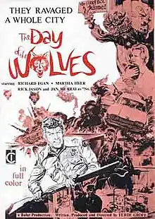 The Day of the Wolves is a 1971 heist movie starring Richard Egan and directed, written and produced by Ferde Grofe Jr., the son of the renowned composer, Ferde Grofe, who had previously worked in the Philippine film industry. It was the first movie to be made on location in the new town of Lake Havasu City, Arizona. This was the last feature film made by actress Martha Hyer and was also the last film made by actor Percy Helton who died about five months after filming wrapped (Helton's last released film was Legend of the Northwest, released in 1978 but made in the 1960s and shelved for a decade).