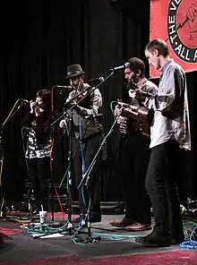 The Down Hill Strugglers, previously known as the Dust Busters, is an American old-time string band trio from Brooklyn, New York, United States.[1] Formed in 2008, the band has been influenced by the music that came out of rural America, including Appalachian traditions, music from the Deep South, and the Western States.[2] The band was originally made up of Craig Judelman, Eli Smith, and Walker Shepard. In 2012, Craig Judelman left the Dust Busters and was replaced by multi-instrumentalist Jackson Lynch. At that time, the band changed its name to the Down Hill Strugglers.