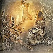 He was by this time an international star and able to secure an audience with Pope Pius XII.[3] By the late 1950s, both religious and cosmic matters preoccupied his work while his canvases became especially large, as if, according to author Kenneth Wach, he was "motivated by a desire to match such admired historical antecedents as the Spanish artists Murillo, Velázquez, and Zurbarán, and thereby to secure his place in the art of the century".[4] When a new pope was being considered in 1958, Dalí was an enthusiastic supporter of Angelo Giuseppe Cardinal Roncalli, to the extent that Roncalli's ear became the subject of his trompe-l'œil composition The Sistine Madonna (1958).[5]