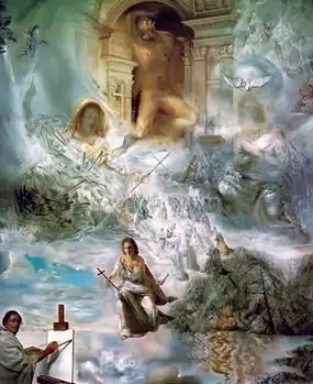 The painting represents several of Dalí's ideas on art and religion. It is heavily inspired by Diego Velázquez, and was completed in time for the 300th anniversary of his death. Dalí had long been influenced by Velázquez, and used images from The Surrender of Breda (1634–35) in his The Discovery of America by Christopher Columbus completed the previous year.[8] As with Dalí, Velázquez painted himself into his Las Meninas (1656), at the lower left portion of the canvas looking out at the viewer with canvas and brush.[9] The arch (St. Peter’s Basilica in Rome) under which God floats in the painting and the composition of the trinity based on Michelangelo's The Last Judgment (1537–41) are references to the art of the Renaissance.[6]