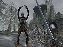 Gameplay in Bloodmoon is largely identical to that in Morrowind, with the game functioning as an extension of quests and open-ended locations to explore. In contrast to the first expansion, Tribunal, which added a city separate from the world map consisting of interior cells, Bloodmoon adds a new island to the original world map. Players access the Bloodmoon content and questline by asking non-player characters about the "latest rumors", directing them to a ship that will transport them to Solstheim, or alternately locating the ship themselves.[1] The expansion is directed towards higher-level characters at or above level 20,[1] with more difficult enemies including wolves, bears, boars, snow goblins, and wood-spirit Spriggans that must be defeated three times before properly killed.[2][3] The game features several new weapon and armor types, including Stalhrim Ice, Nordic Silver and Snow Wolf, with players able to complete a quest that provides access to non-player characters that can exchange weapons and armor from ice and pelts.[3]