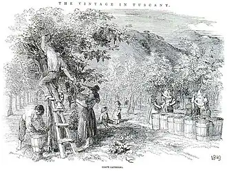 The 'marriage' of elm trees and vines continued in Italy from Roman times into the 20th century.[2] There are references to this both in works on husbandry and in poetry. The most famous of the latter was Ovid's account of the myth of Vertumnus and Pomona in his Metamorphoses. Vertumnus takes the shape of an old woman and urges the reluctant goddess to marriage by pointing to the vine in her orchard. In the version by the work's first English translator, Arthur Golding: