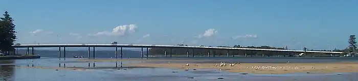 The Entrance Bridge links The Entrance with The Entrance North over The Entrance Channel as part of Wilfred Barrett Drive. It was originally a wooden single lane bridge with bypass bays and a traffic light that allowed traffic travelling in the opposite direction to pass.[13] It was opened in 1934. The original bridge was adequate until 1965 as it only served traffic travelling as far as The Entrance North.