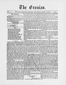 The Exonian is the bi-weekly student-run newspaper of Phillips Exeter Academy in Exeter, New Hampshire.[1][2][3][4][5][6][7] It has been printed continuously since April 6, 1878, making it the oldest continuously-published preparatory school newspaper in the country. It is published weekly by its student board and is subject to limited faculty censorship. Many parents and alumni hold subscriptions to the paper, which acts as a forum for the ideas of the Exeter community and prints extensive news, investigative, opinion, sports, and feature articles. In 2011, the newspaper became available to all students free of cost.