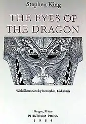 The Eyes of the Dragon is a fantasy novel by American writer Stephen King, first published as a limited edition slipcased hardcover by Philtrum Press in 1984, illustrated by Kenneth R. Linkhauser. The novel would later be published for the mass market by Viking in 1987, with illustrations by David Palladini. This trade edition was slightly revised for publication. The 1995 French edition did not reproduce the American illustrations; it included brand new illustrations by Christian Heinrich, and a 2016 new French version also included brand new illustrations, by Nicolas Duffaut.[1]