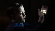 LaBelle was unaware of the casting of David Lynch as John Ford until the day the scene he had to do with him was filmed. He recalled that once Lynch came onto the set, it enabled him to embody Sammy and how he was feeling, recalling "[Lynch is] a great guy. But leading up to it, Sammy's nervous, so I'm getting nervous."[51] The scene itself was written to historically match how the actual real-life encounter between Spielberg and Ford went down, with the latter's dialogue written exactly word-for-word, most notably Ford's advice to Sammy about framing: "When the horizon's at the bottom, it's interesting. When the horizon's at the top, it's interesting. When the horizon's in the middle, it's boring as shit!"[52] The scene itself received acclaim by critics and audiences and won the award for Best Scene at the 2022 St. Louis Gateway Film Critics Association Awards.[53] The last shot of the film, where the camera breaks the fourth wall and re-frames the horizon on the image of Sammy walking on the studio lot, was already in the script prior to filming. Drew Taylor of TheWrap named it the best final shot of the year, saying that it leaves the movie on "such a happy, hopeful note" and it metaphorically represents Spielberg's "admission that he might be the most revered filmmaker in the history of the medium, but he still screws up and he's still got plenty to learn. The master is still a student. It's easy to forget what John Ford yelled at you all those years ago."[54] Matthew Jacobs of The Hollywood Reporter also called the moment one of the best closing shots of Spielberg's career.[50] The film's iconic shot of Mateo Zoryan Francis-DeFord as young Sammy projecting his first 8mm film onto his hands was not initially planned until during pre-production when "Spielberg happened to project something on his hand while they were watching old home movies." Upon witnessing this, Kaminski knew it had to be incorporated, calling it a visual "metaphor of the entire movie: [Sammy] can have the image in his hand and shape it."[55]