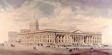 In 1850, the Port Phillip District of New South Wales was granted separation, officially becoming the colony of Victoria on 1 July 1851. In the wake of a gold rush the following month, Victoria emerged as Australia's richest colony, and Melbourne, its capital, Australia's largest and wealthiest city. With Melbourne's rapid growth came calls for the establishment of a public art gallery, and in 1859, the Government of Victoria pledged £2000 for the acquisition of plaster casts of sculpture.[3] These works were displayed in the Museum of Art, opened by Governor Sir Henry Barkly in May 1861 on the lower floor of the south wing of the public Library (now the State Library of Victoria) on Swanston Street.[4] Further money was set aside in the early 1860s for the purchase of original paintings by British and Victorian artists. These works were first displayed in December 1864 in the newly opened Picture Gallery, which remained under the curatorial administration of the Public Library until 1882.[5][6] Grand designs for a building fronting Lonsdale and Swanston streets were drawn by Nicholas Chevalier in 1860 and Frederick Grosse in 1865, featuring an enormous and elaborate library and gallery, but these visions were never realised.