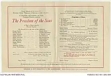 The Freedom of the Seas is a 1918 British comedy play by Walter C. Hackett. A downtrodden London clerk joins the Royal Navy during the First World War. Given command of a tramp steamer he rises to the occasion and thwarts the plans of a German spy.[1] It appeared at the Royalty Theatre before transferring to the Theatre Royal, Haymarket where the cast included Dennis Eadie, Billie Carleton, Tom Reynolds, Marion Lorne, Randle Ayrton, Sydney Valentine and James Carew.