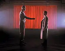 The Giant apparently inhabits an elderly Room Service Waiter of the Great Northern Hotel (played by Hank Worden).[2] Also, the Giant wears a similar outfit to the Waiter (who in himself is a ghostly semi-conscious entity who almost never appears in a crowd or within the guests rooms of the Great Northern). In the final episode, when Cooper has entered the Black Lodge, both the Waiter and the Giant appear and the latter confirms their identity, stating: "One and the same".