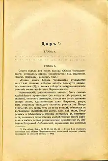 The Gift's fourth chapter, a pseudo-biography of the Russian writer Nikolay Chernyshevsky, was censored from publication in the Russian émigré journal Sovremennye zapiski that published the book's four other chapters.