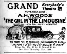The Girl in the Limousine is a play written by Wilson Collison and Avery Hopwood.[1] The story is a bedroom farce about a man who accidentally finds himself undressed in the bedroom of his ex-girlfriend. Producer A. H. Woods staged it on Broadway in 1919. The production was a success, closing at the end of January 1920 after 137 performances. The play was adapted into a movie in 1924.