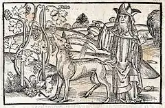 When a goat starts eating a vine's leaves and shoots, the vine retorts that it will still have enough juice left to produce grapes, the wine from which will be poured over it when the goat is sacrificed. The earliest record of the fable is in an epigram by Leonidas of Tarentum, who lived in the area of southern Italy colonised by Greeks in the 3rd century BCE.[1] Later Greek references come from Western Asia, including another epigram by Evenus of Ascalon containing simply the vine's retort[2] and the prose collection of fables by Aphthonius of Antioch.[3] Elsewhere in Europe it first appeared in Latin fable collections from German language areas, including Sebastian Brant's Esopi Appologi sive Mythologi (1501)[4] and the 150 poems based on fables by Pantaleon Candidus (1604).[5] The tale only began to appear in English fable collections in the 19th century.