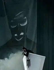 Manson began his long-term collaboration with Austrian-Irish artist Gottfried Helnwein in May 2002, collaborating on several projects associated with the album.[29] In addition to the album artwork, the pair created large-scale multi-media installation art pieces that would go on to be exhibited in various galleries throughout Europe and the United States.[30] These were also displayed at the album's launch party at The Key Club in Los Angeles.[31] They also worked together on the music video to lead single "Mobscene" (stylized as "mOBSCENE"),[32] as well as images which accompanied Manson's essay for The Rock and Roll Hall of Fame and Museum.[29] Helnwein later expressed disappointment that the latter was not selected as the album cover.[33] Many of the images found in the album artwork were inspired by illustrations found in Mel Gordon's 2000 book Voluptuous Panic: The Erotic World of Weimar Berlin.[34] Concerned that Gordon might take issue with use of the book's material, Manson called Gordon, who said he could not imagine a greater compliment than a popular music album based on an academic book.[35] The Golden Age of Grotesque was also the title of Manson's first art exhibition, which took place in September 2002 at the Los Angeles Contemporary Exhibitions Center.[36]