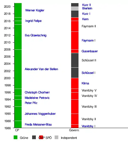 The chart below shows a timeline of the Green chairpersons and the Chancellors of Austria. The left green bar shows all the chairpersons (Bundessprecher, abbreviated as "CP") of the Green party, and the right bar shows the corresponding make-up of the Austrian government at that time. The red (SPÖ), black (ÖVP), and light grey (Independent) colours correspond to which party led the federal government (Bundesregierung, abbreviated as "Govern."). The last names of the respective chancellors are shown, the Roman numeral stands for the cabinets.