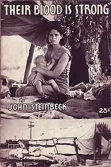 In 1938, the feature-story articles were published as the pamphlet Their Blood Is Strong, by the Simon J. Lubin Society, a non-profit organization dedicated to educating Americans about the socio-economic plight of the migrant worker. The pamphlet included the seven articles, plus Steinbeck's new epilogue "Starvation Under the Orange Trees" and twenty-two photographs of the migrant workers, by Dorothea Lange;[2][3] ten thousand copies of Their Blood Is Strong were sold at twenty-five cents each.[4]