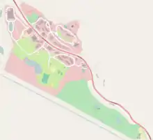 The facility known as the Hole is located on the Church of Scientology's Gold Base, built on the site of a resort called Gilman Hot Springs in the California town of San Jacinto. The base covers 520 acres (210 ha) bisected by a public highway, Gilman Springs Road, just off California State Route 79. It was secretly acquired by Scientology in 1978[4]: 256 under the alias of the "Scottish Highland Quietude Club".[5]: 175 Scientology established a secret base there which was staffed by members of the Sea Org, an inner core of Scientologists which is said to number some five to seven thousand people.[6] There are now two Sea Org bases in the compound: Gold, which houses the Church's in-house film studio Golden Era Productions, and Int, the Church's international headquarters, though in practice the whole site is usually called Gold Base.[5]: 175